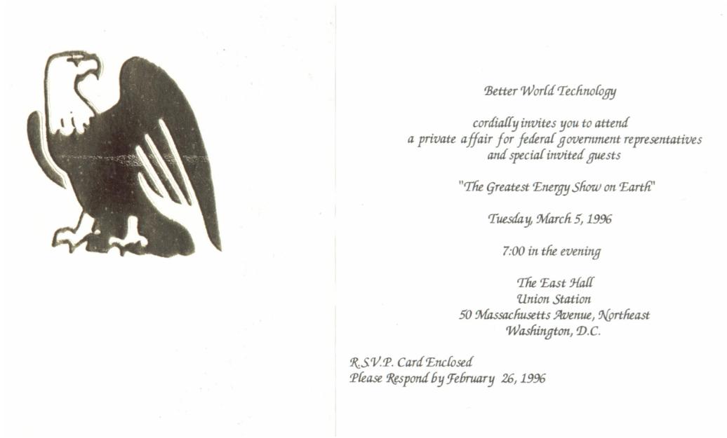 From January to March, 1996 UCSA conducted a national tour demonstrating technologies that would end the need for burning fossil fuels to generate electricity. The last show in the tour was held in Washington D. C. on March 5, 1996.